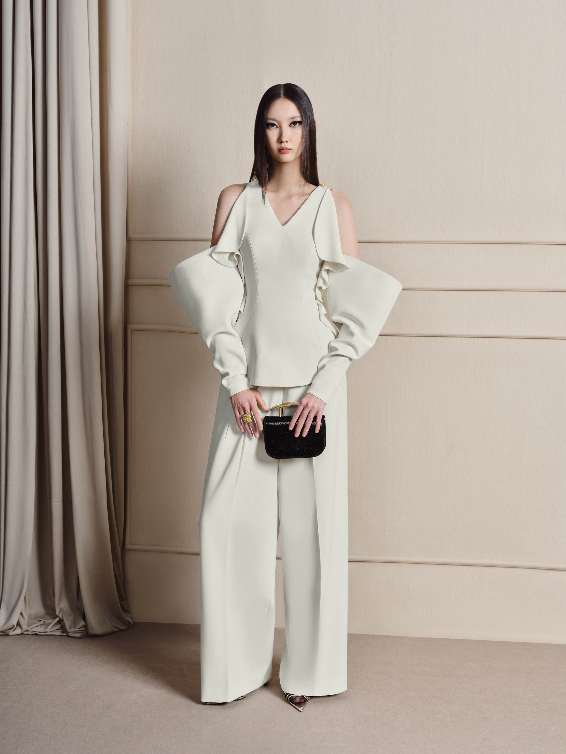 The ruffles aren't just trim. They're architectural elements, carefully constructed to create volume and flow without overwhelming the silhouette. The sleeves are fitted at the wrists, creating a polished finish that balances the drama of the ruffles. The coordinating wide-leg trousers flow in pristine cream, creating a monochromatic look that is both modern and timeless. The high-waisted cut and floor-length hem create an elongated, elegant silhouette. Each piece is meticulously crafted to work together as a complete ensemble, while offering the versatility to be styled separately. The ruffled cold shoulder top transforms simple black trousers into evening elegance, while the cream wide-leg pants elevate any silk blouse into something special.