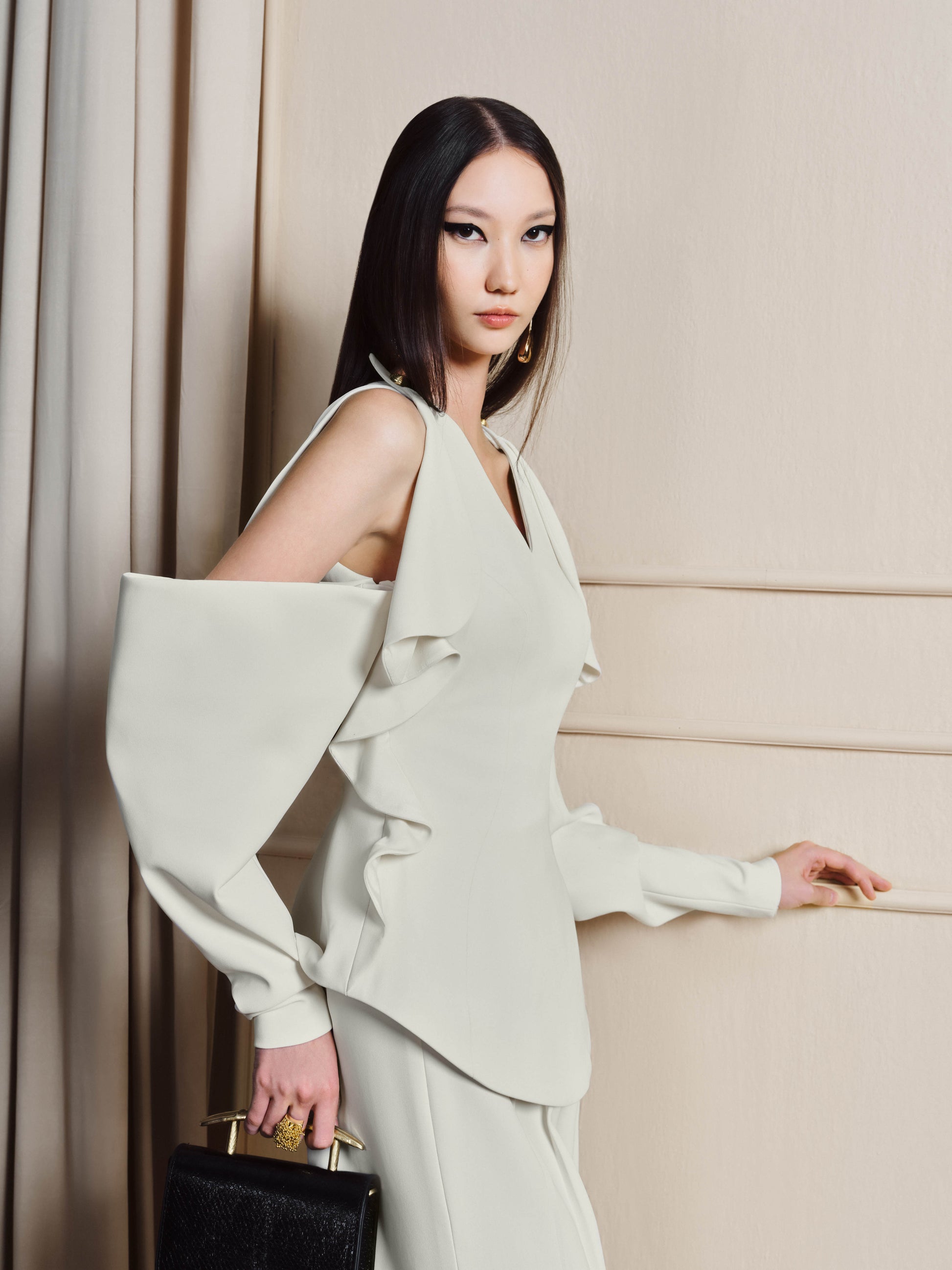 Store hanging separately in breathable garment bags to protect the delicate ruffled sleeves and maintain the structured silhouettes. Keep away from direct sunlight to prevent color fading. The silk ruffles require extremely gentle handling to avoid creasing or damage. The cold shoulder cutouts should be handled carefully to maintain their clean lines. Professional dry cleaning is essential, with special attention to the ruffled sleeves. For optimal preservation, consult with a specialist luxury garment care service.