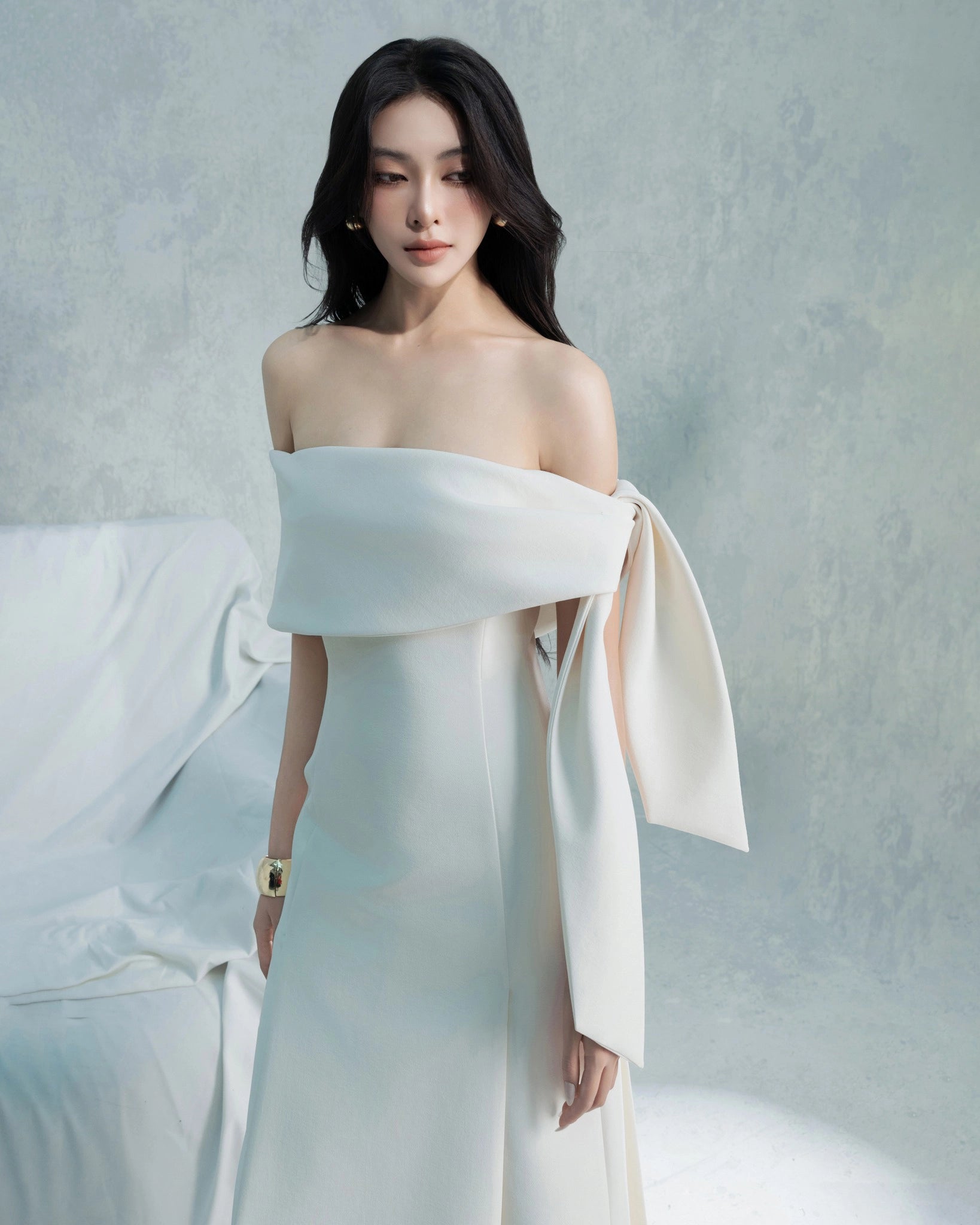 The structured off-the-shoulder bodice frames the décolletage with refined precision, while the oversized bow drapes gracefully along one side, creating an asymmetrical cascade of fabric that moves with poetic fluidity. The clean column silhouette flows to the floor with understated elegance, allowing the architectural shoulder detail to command attention. Each movement reveals the masterful construction, where structured form meets effortless grace in perfect harmony.