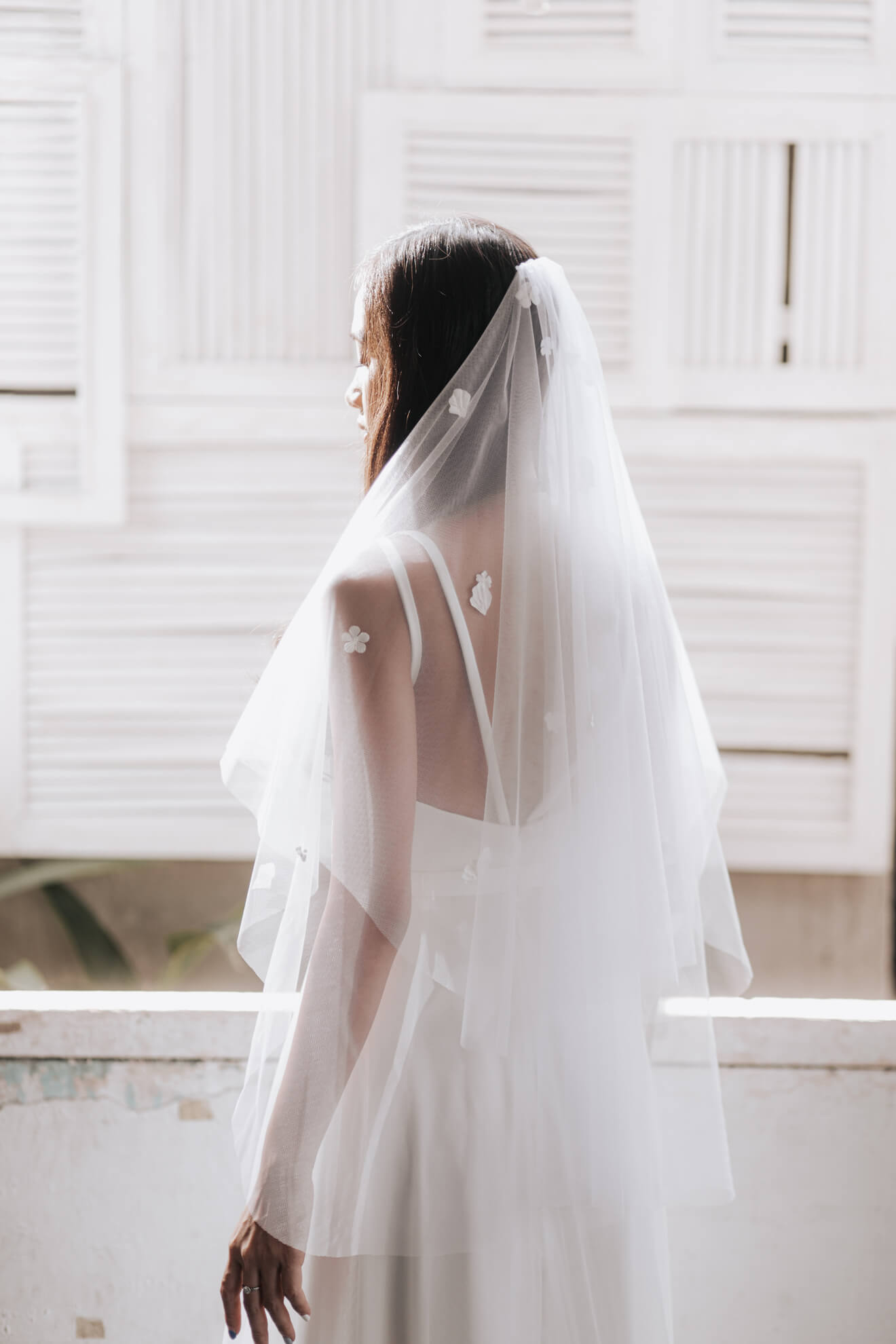 The Seraphina Cirque veil features delicate floral appliqués scattered gracefully across the tulle, creating an ethereal and romantic aesthetic. The cirque style offers a shorter, sophisticated length that frames your face beautifully, while each bloom is artfully placed to evoke the lightness and beauty of flowers floating through the sky.