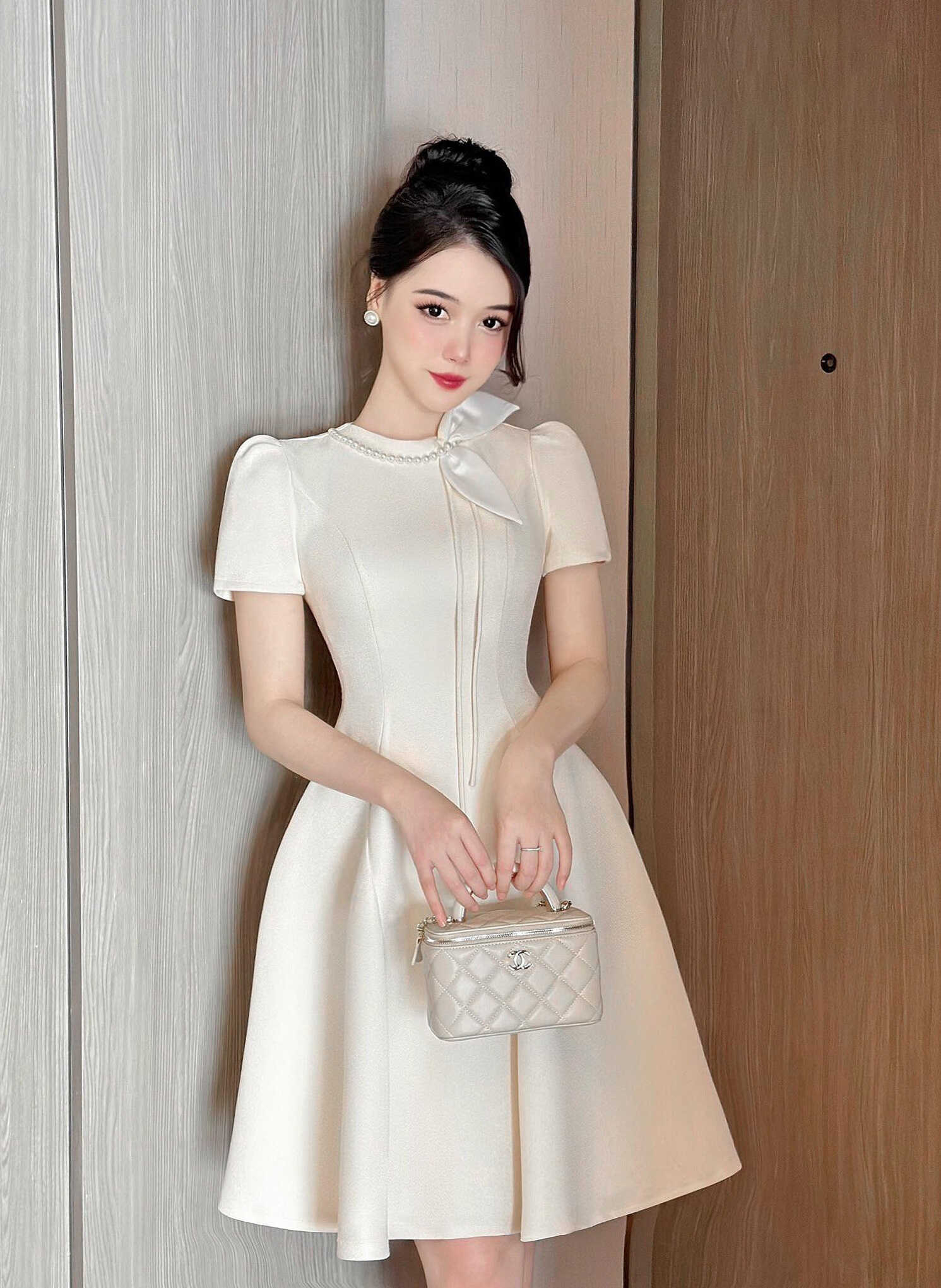 The round neckline is adorned with a delicate strand of pearls that adds luminous sophistication, while structured puff sleeves create dramatic volume that frames the shoulders with architectural precision. A sculptural bow accent at the shoulder adds an asymmetrical element of romance. The fitted bodice, defined by princess seams, flows seamlessly into a full A-line skirt that falls to knee length. Each movement reveals the dress's masterful construction, where structured tailoring meets graceful fluidity in perfect harmony.